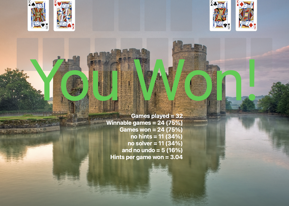 A beautiful solitaire game that supports undo/redo and includes a solver for those particularly tough games. Statistics include games played, games won, games won without hints and games won without using undo.